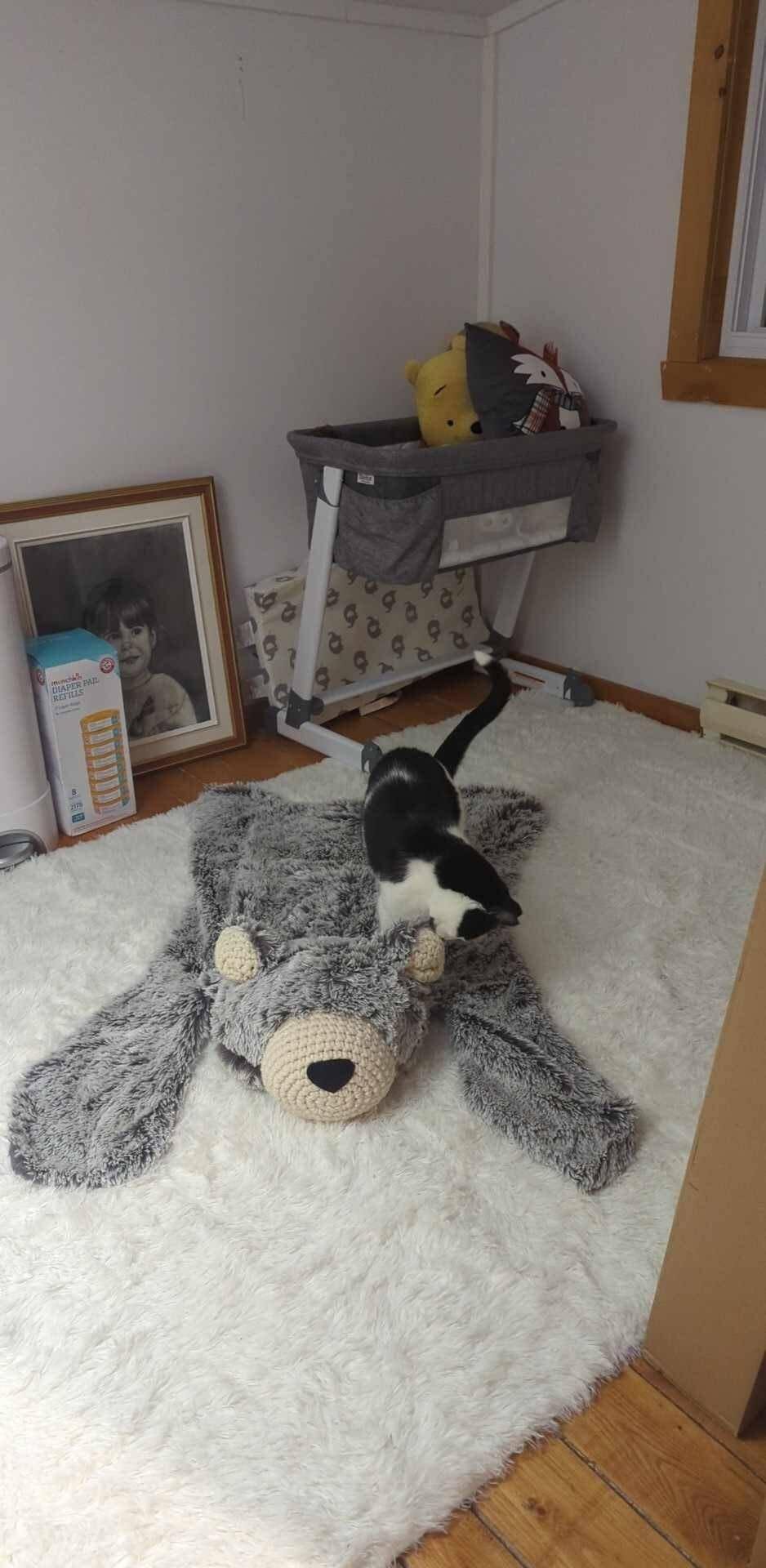 Get cozy with our handmade plush Gray Bear Rug. This soft and cuddly nursery bear rug features charming crochet accents. Bring some warmth and cuteness into your life with this unique plush woodland nursery rug. This plush faux fur rug is lined with a soft flannel fabric and features crochet ears and muzzle.