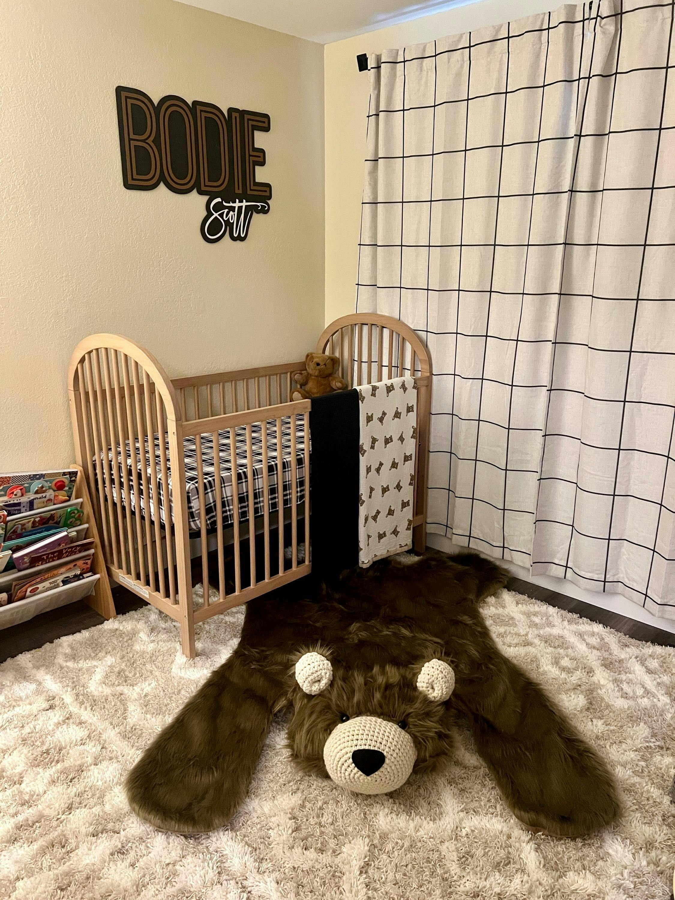 This Bear Rug for Nursery is made with faux fur, polyester stuffing, yarn, and felt.