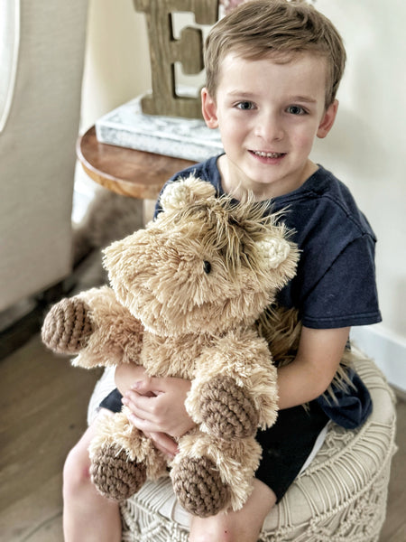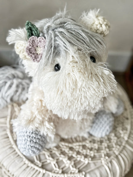 Get cozy with our handmade Horse Plush. This poney comes in two color options Ivory and Gray Faux Fur, or Tan and Brown Faux Fur. This charming ClaraLoo Poney Stuffed Animal is perfect for a farm or cowboy themed nursery, big kid room, or other special space in your home. Made with plush minky faux fur and impeccably detailed with adorable crochet ears and hooves, this Poney plush will transform your space into a cozy farmhouse retreat. Bring the beauty and warmth of the great outdoors inside with this unique and charming piece.