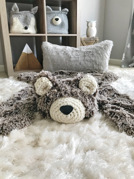 ClaraLoo Brown Frosted Minky Bear Rug. This plush faux fur rug is lined with a soft flannel fabric and features crochet ears and muzzle.